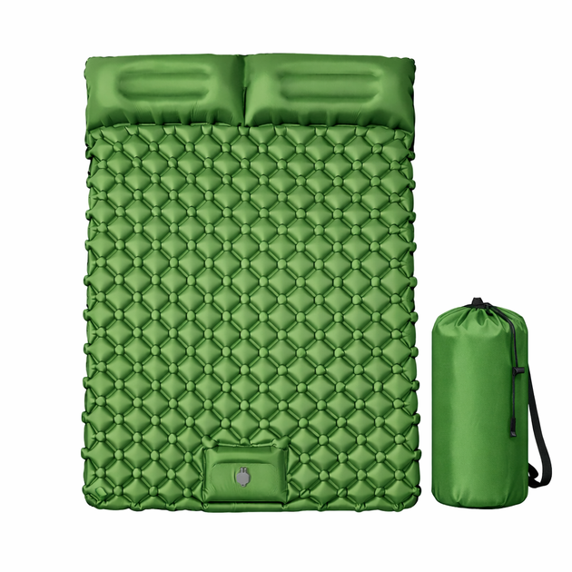 - Матрац оснащений вбудованою системою накачування, тому його можна надути без додаткового насоса. Достатньо кількох натискань або простих рухів, щоб він швидко набрав повітря. Це зручно в поході, на природі чи в дорозі, коли під рукою немає окремого насоса.