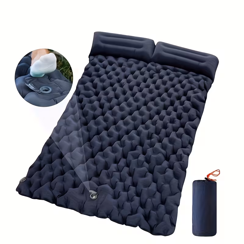 - Матрац виготовлений із водонепроникного матеріалу, тому не боїться вологи та сирої землі. Товщина 6 см забезпечує м’якість, ізоляцію від холоду та комфортний сон навіть на нерівній поверхні. Завдяки зручному клапану він легко накачується, а еластична структура рівномірно розподіляє вагу тіла.